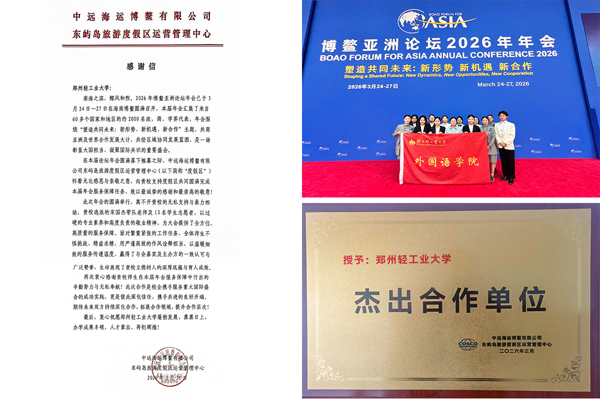 大河网讯 近日,博鳌亚洲论坛2026年年会在海南博鳌举行。郑州轻工业大学“译心传承”多语种志愿服务队受邀参与此次年会志愿服务,以专业素养圆满完成各项任务,获承办单位来信致谢,并被授予“杰出合作单位”荣誉称号,成为年会中一道亮眼的青春风景线。